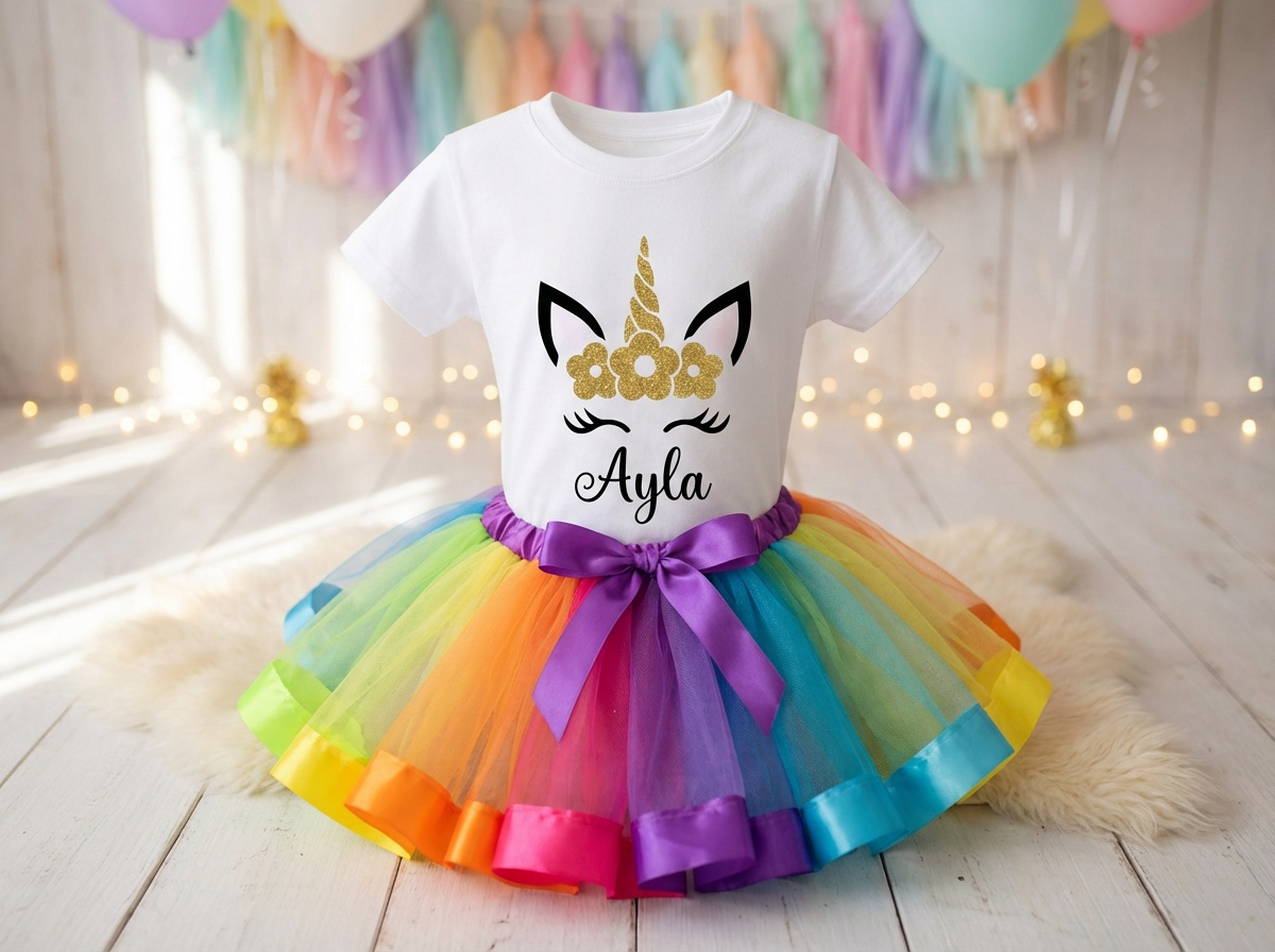 Make their special day even more magical with our beautiful Personalised Rainbow Unicorn Tutu Outfit. Perfect for birthdays, parties, photoshoots, or dress-up fun, this colourful set is designed to make your little one feel like a true unicorn princess.